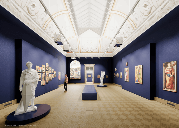 dass das Gemälde wieder in seinem ursprünglichen Gesamtbild erstrahlt. Planerisch schreitet auch die Mediengestaltung der Ausstellungsräume voran. Geplant ist ein modernes, zukunftsorientiertes Museum mit flexiblem Belichtungssystem, Beamertechnik und Soundanlagen, wodurch die klassischen Kunstwerke ganz neu erlebbar werden. Um die tatsächlichen akustischen und sensorischen Bedingungen zu überprüfen, ist eine 1:1 Belichtungs- und Soundprobe in ausgewählten Musterräumen forciert. Der Aufzug soll nicht nur im Rahmen der Barrierefreiheit und des Transports eine Rolle spielen, sondern auch als gestalterisches Element fungieren. Derzeit werden Materialproben nach ästhetischen und funktionalen Aspekten bewertet, während die Detailplanung weiter intensiviert wird. Zugleich werden Lose für die Ausschreibungen zu Rohbaumaßnahmen am Bestandsgebäude sowie zum neuen Stadtgeschoss vorbereitet, Teile der Naturwerksteinfassade und Metallelemente werden ebenfalls restauriert. Voraussichtlich 2026 wird es dann sichtbare Baumaßnahmen auch im Außenraum des Museums geben.