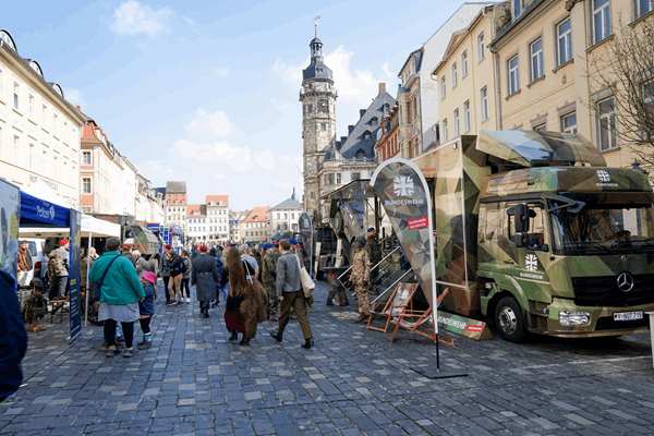 Ein selten belebtes Bild bot sich am Donnerstag in der Altenburger Innenstadt: Zum öffentlichen Gelöbnis der Bundeswehr auf dem Marktplatz strömten zahlreiche Besucherinnen und Besucher in die Stadt. Neben Angehörigen der rund 300 Rekrutinnen und Rekruten verfolgten auch viele Interessierte die feierliche Zeremonie.