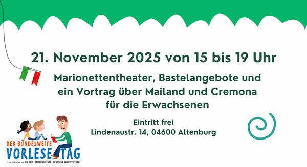 Im Mittelpunkt des Nachmittags stehen italienische Geschichten, bekannte Figuren und thematische Angebote für unterschiedliche Altersgruppen. Die Altenburger Stadtbibliothek in der Lindenaustraße 14 öffnet dazu ihre Räume und verwandelt sich für einen Tag in einen lebendigen Treffpunkt für Familien, Kinder, Literaturfreunde und neugierige Besucher. Parallel zum Vorleseprogramm bleibt der gesamte Ausleihbetrieb…