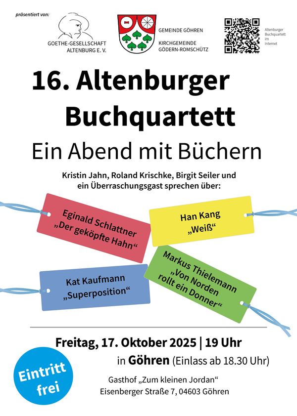 Was liest man im Herbst? Antworten darauf liefert das 16. Altenburger Buchquartett, das am Freitag, den 17. Oktober 2025, im Gasthof „Zum kleinen Jordan“ (Eisenberger Straße 7, Göhren) Station macht. Die Veranstaltung ist eine Kooperation der Goethe Gesellschaft Altenburg e. V. mit der Ev.-Luth. Kirchgemeinde Gödern-Romschütz.