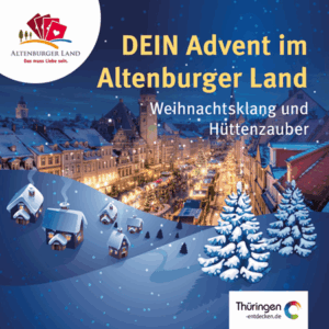 Der Tourismusverband Altenburger Land e.V. hat dafür erneut Adventsangebote des Landkreises in der Kampagne „DEIN Advent“ gesammelt und übersichtlich gebündelt. Unter www.altenburg.travel/dein-advent finden sich Advents- und Weihnachtsmärkte, Konzerte, Ausstellungen, Führungen, Theatererlebnisse sowie kulinarische Angebote – große wie kleine Formate, verteilt über Orte, Gemeinden und Städte des Altenburger Landes.